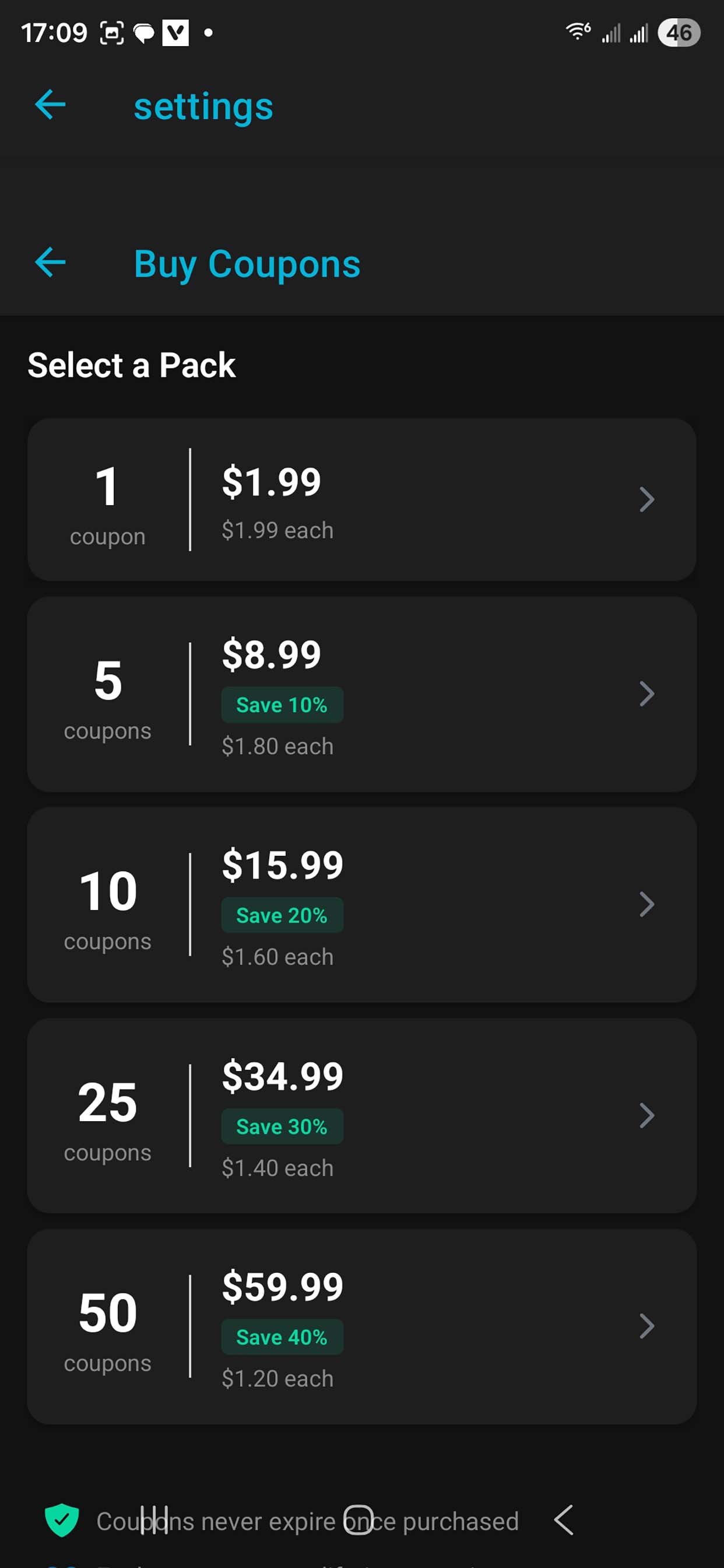 - Purchase coupon packs in bulk (1, 5, 10, 25, or 50 coupons)