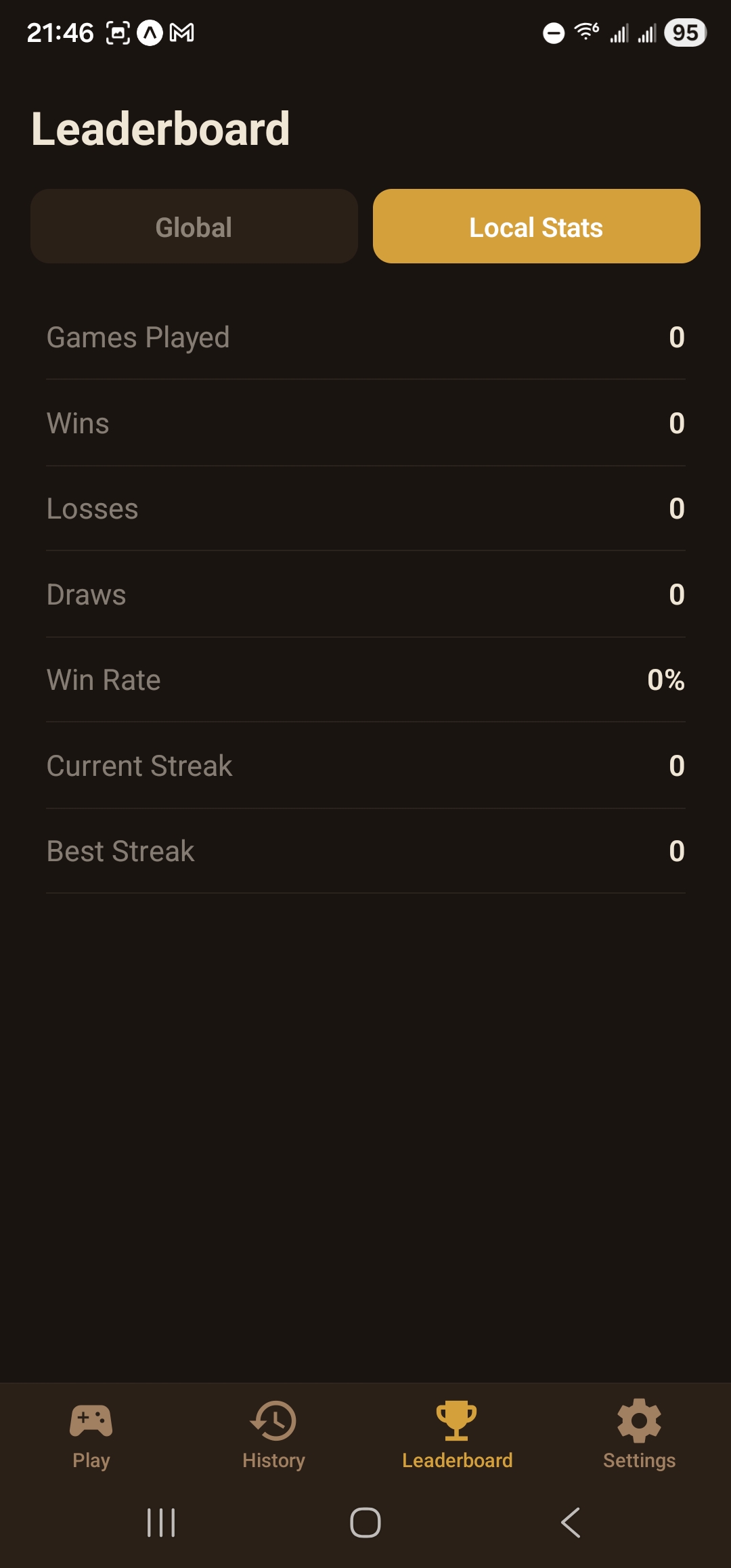 Browse all your completed games in the dedicated History tab. See results at a glance with win/loss/draw badges, player names, game mode, move count, and the date each game was played. Resume any game still in progress directly from the home screen.
