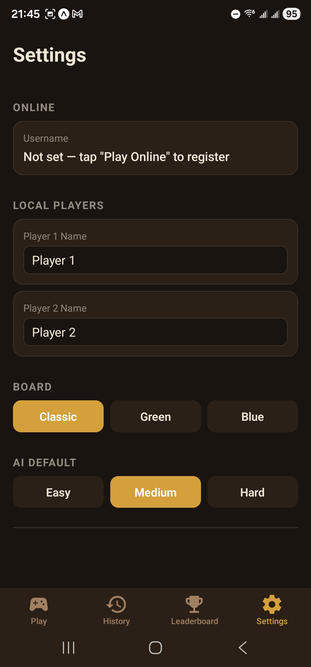 - Default AI difficulty — Set your preferred difficulty so you can jump straight into a game.